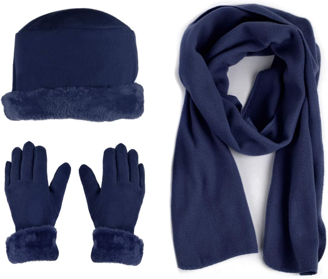 Women's Navy Solid Fleece 3-Piece gloves scarf Hat Winter Set