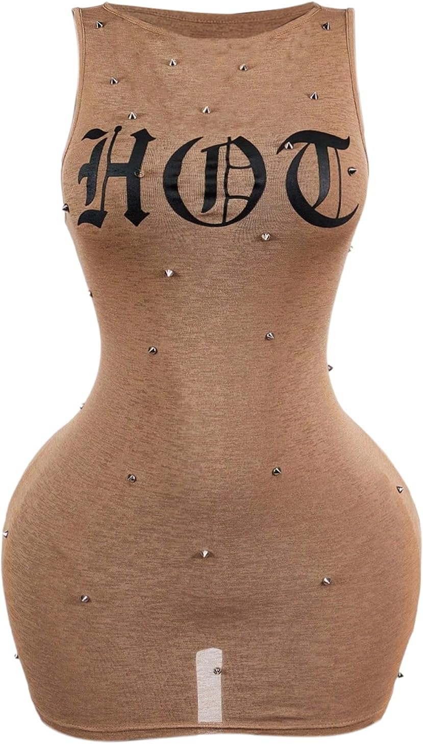 Women's Summer Letter Print Mini Tank Dress Y2k Rivet Crew Neck Bodycon Party Club Dresses Streetwear