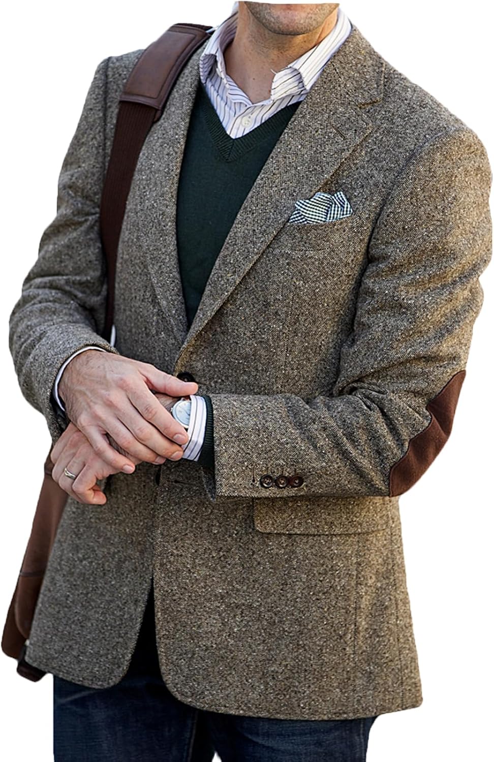VENNYNG Men's Tweed Blazer Suit Jacket with Elbow Patches Autumn Blazer Male Vintage Short Trench Coat