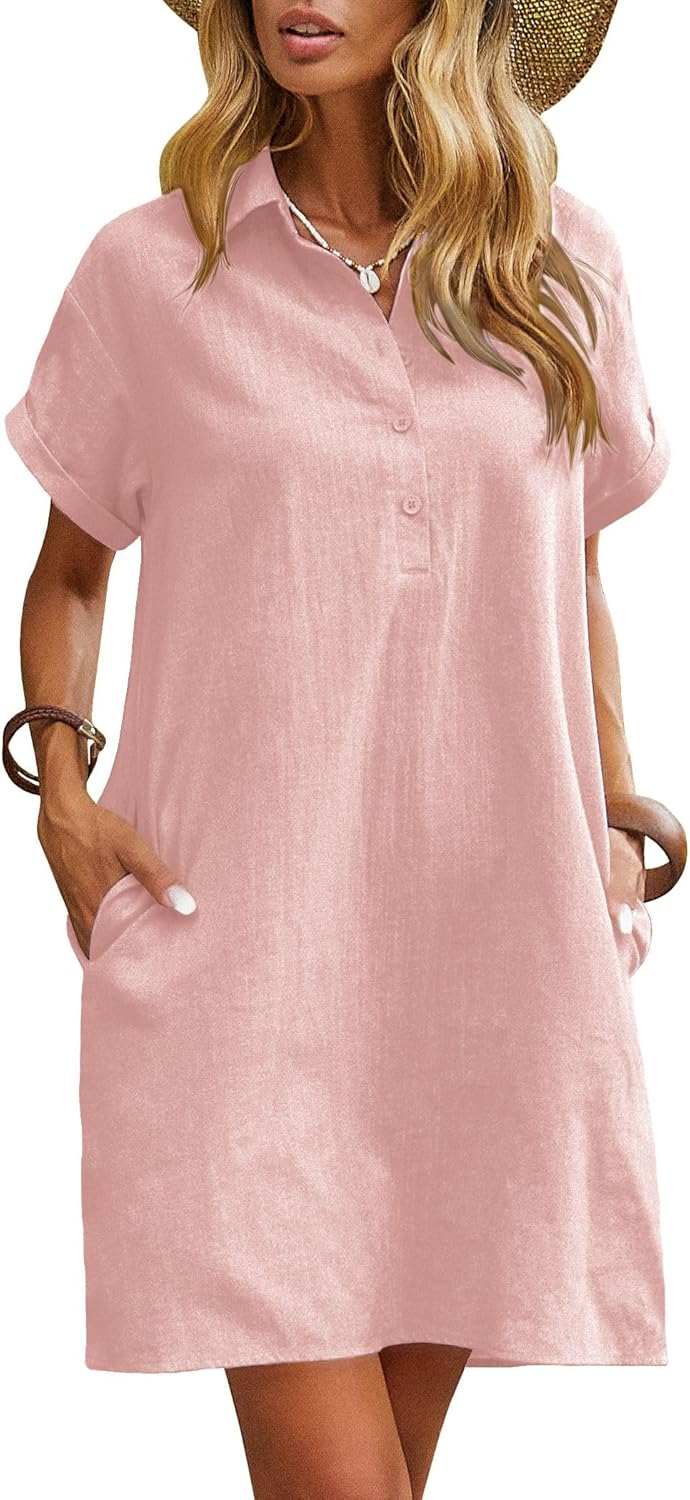 Zeagoo Womens Cotton Shirt Dress Summer Casual Short Sleeve Button Down Beach Cover Up Shirts with Pockets