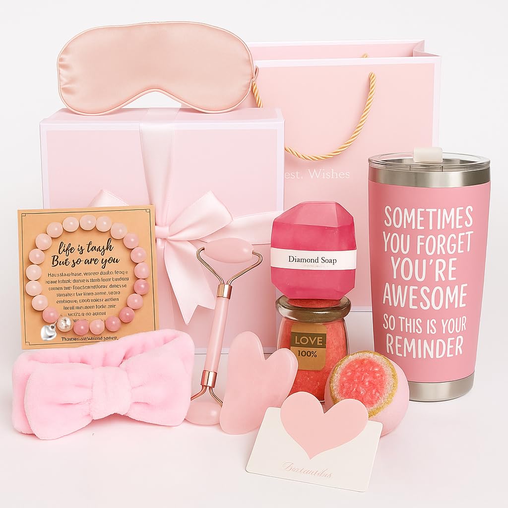 - 12PCS All-In-One Gift Set: Includes 1 pink insulated tumbler (with "Sometimes You Forget You’re Awesome" print), 1 pink beaded bracelet (with encouraging card), 1 silk eye mask, 1 face roller, 1 heart-shaped gua sha, 1 bath bomb, 1 diamond soap, 1 bath salts jar, 1 pink headband,1Greeting Card and an elegant pink gift box and gift bag(ready to gift).