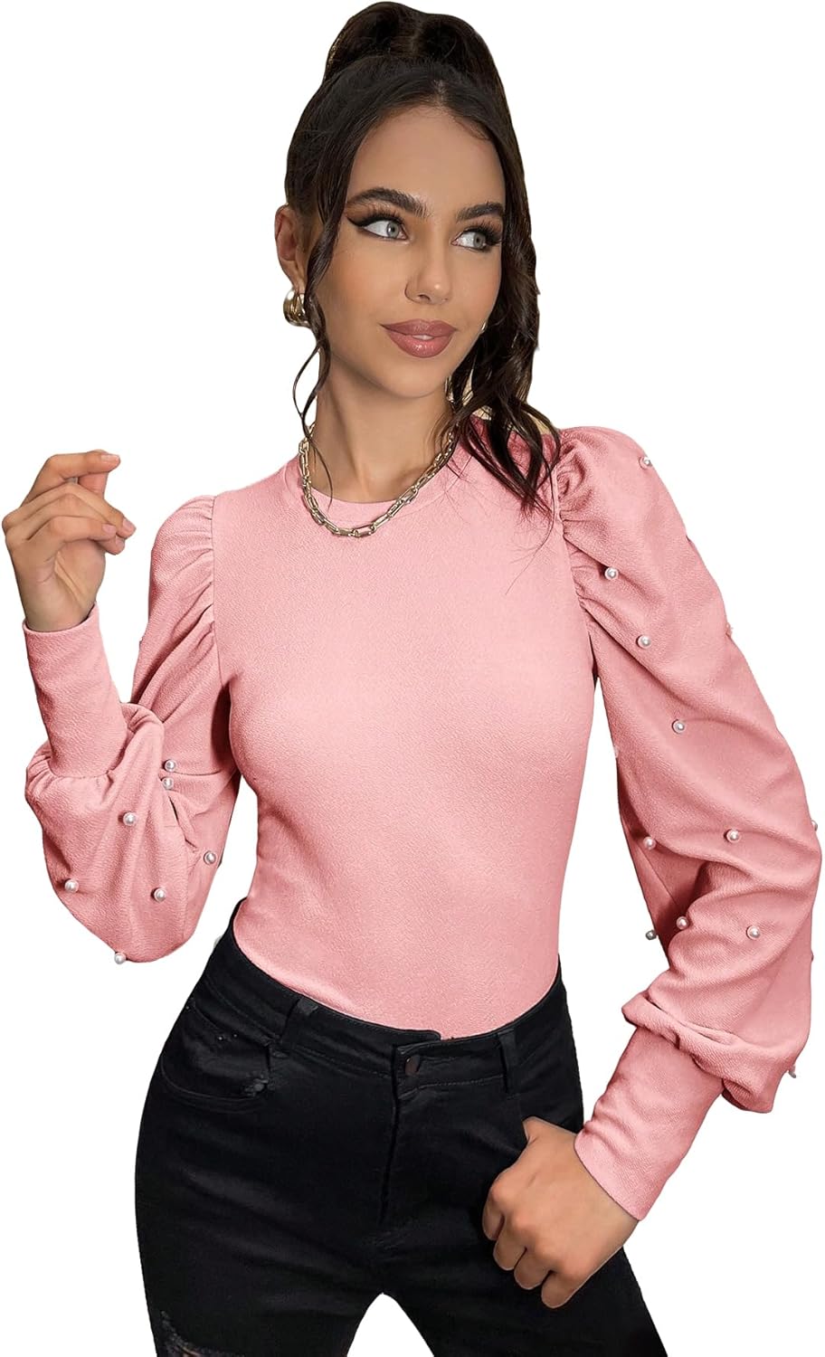 Floerns Women's Solid Puff Sleeve Crew Neck Casual T Shirt Top