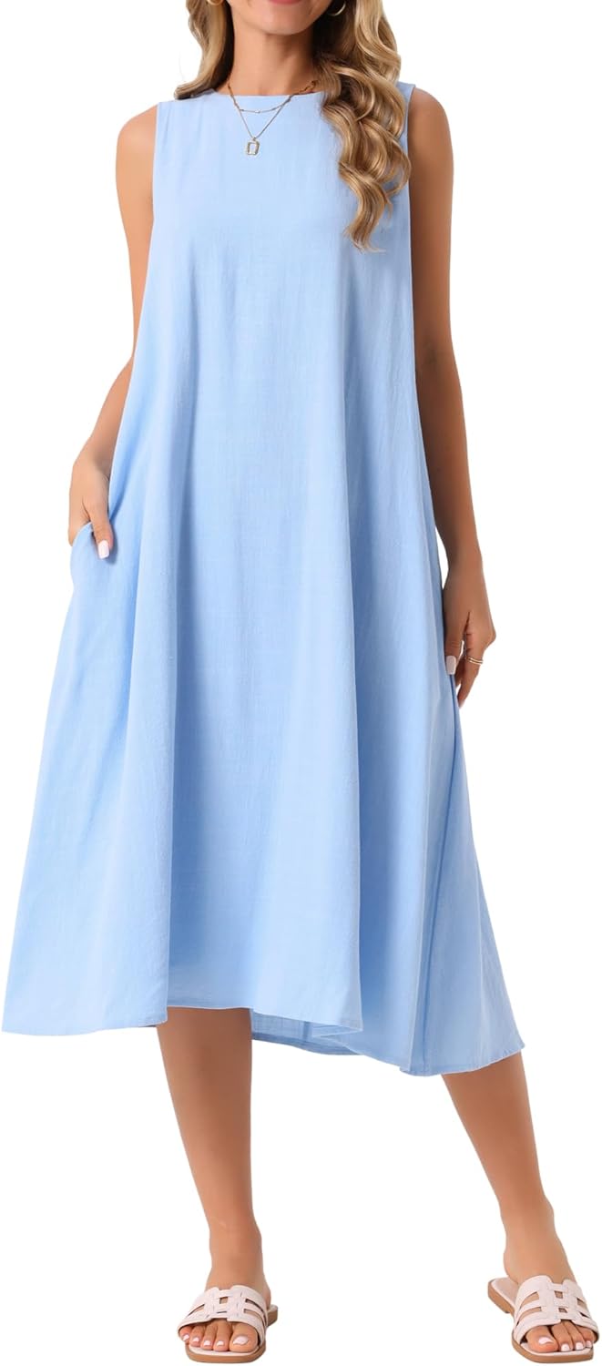 Seta T Women's Linen Dresses Crewneck Loose Fit Shift Sleeveless Sundresses Casual Tank Dress with Pockets