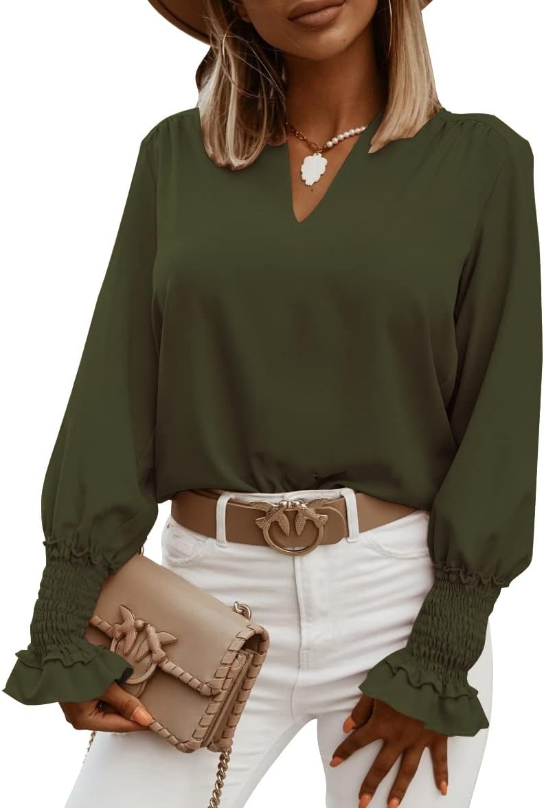 LYANER Women's V Neck Shirred Bell Long Sleeve Blouse Casual Tunic Top
