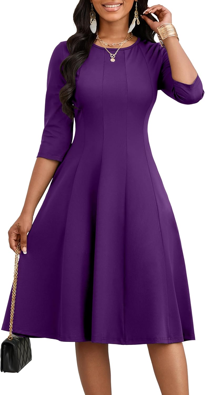 CLOCOR Casual Midi Dresses for Women A-Line Fit and Flare Elegant Church 3/4 Sleeve Crew Neck Dress with Pocket
