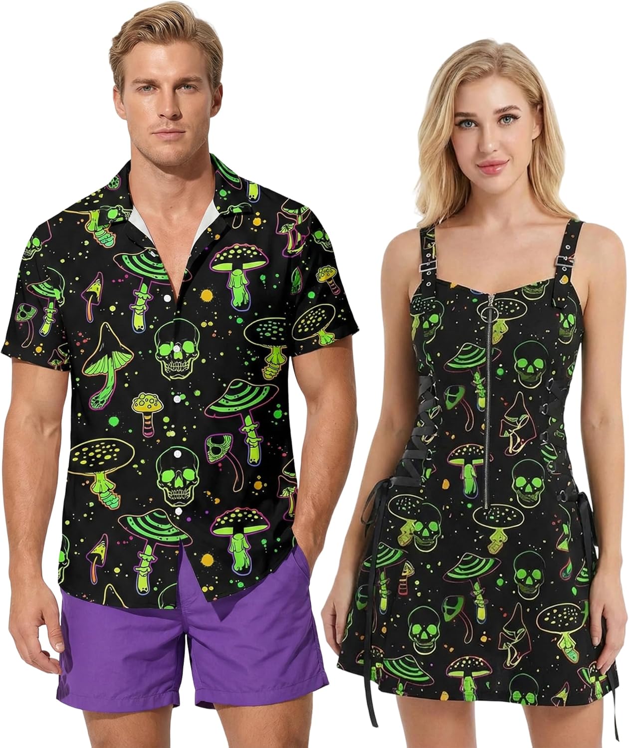 DRESSFO Matchable Couples' Outfit Nightclub Printed Button-up Shirt Or Half Zipper Lace Up Mini Dress
