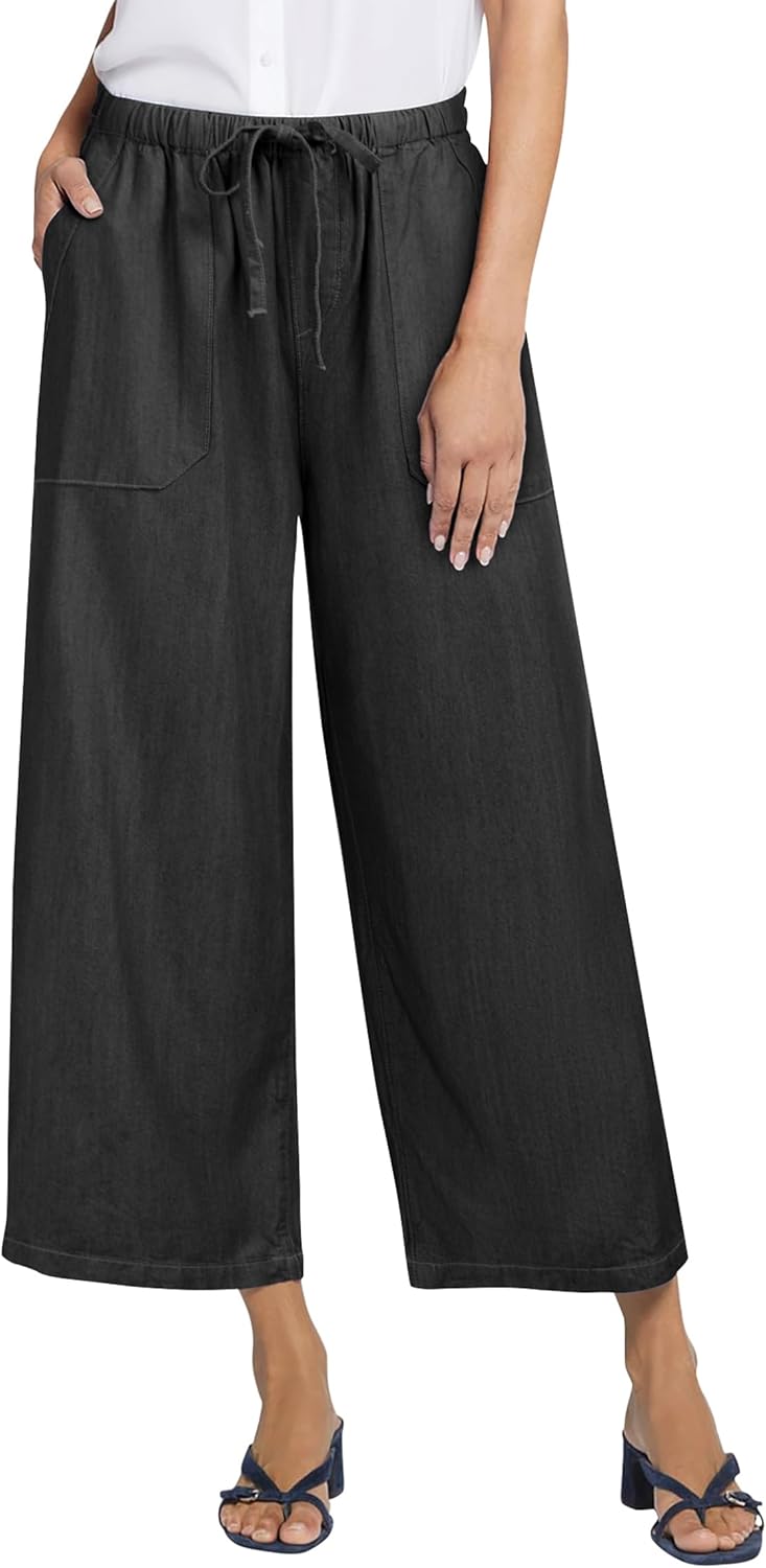 Women's Wide Leg Baggy Cropped Jeans with Elastic Waist Pull On Lightweight Loose Fit Denim Pants with Pockets