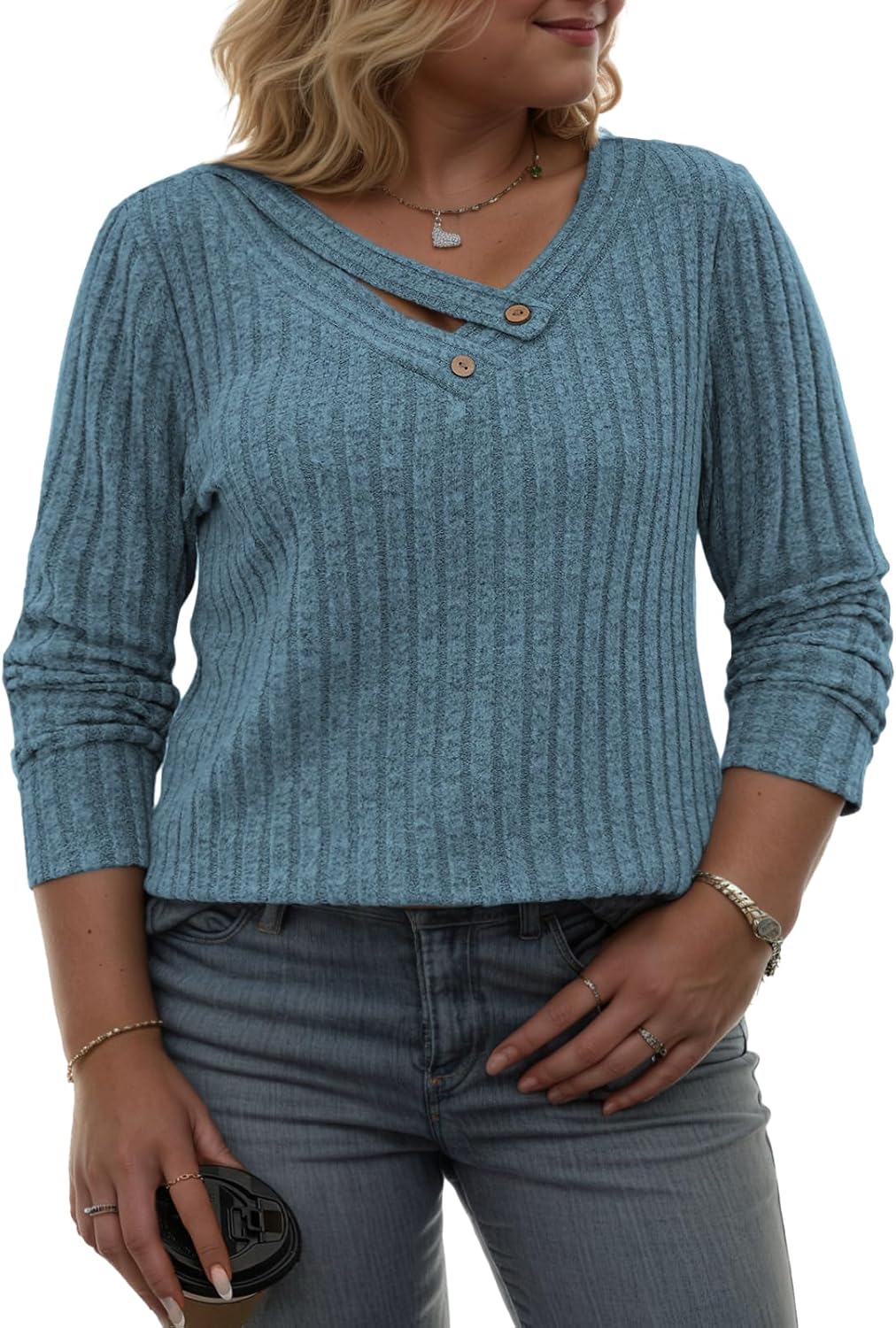 VISLILY Womens-Plus-Size-Tops Trendy V Neck Casual Long Sleeve Shirts Lightweight Knit Sweaters Button Decor Tunics Blouses