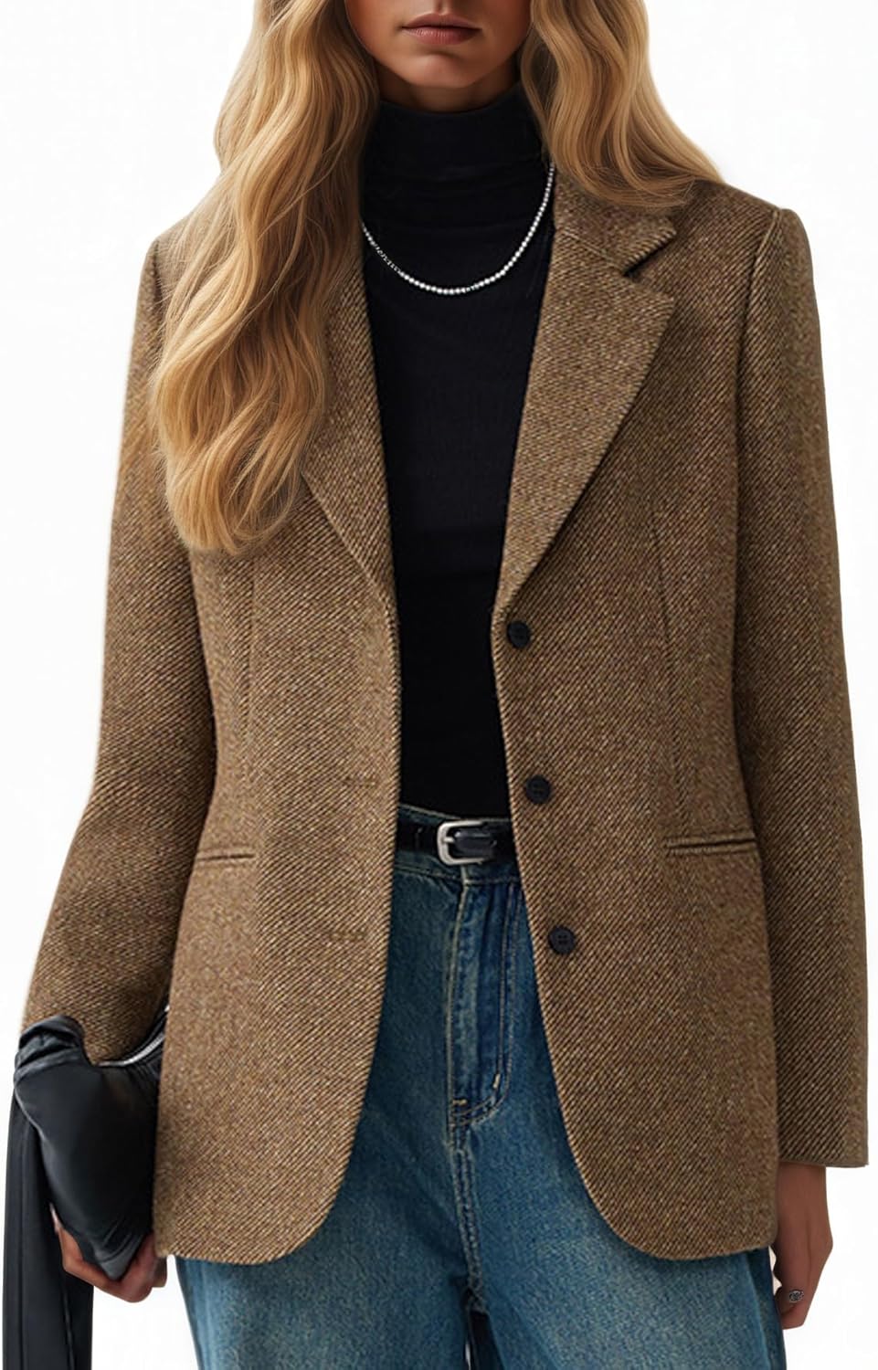 Mina Self 2026 Spring Women Herringbone Tweed Wool Blazer-Lapel Collar Business Casual Long Sleeve Office Jacket with Pockets