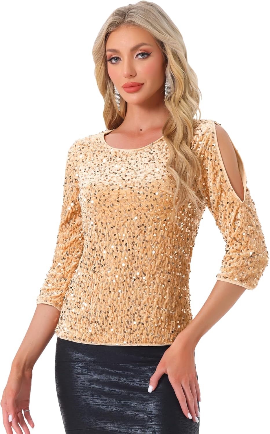 Allegra K Sparkle Sequin Velvet Tops for Women's Cut Out Half Sleeve Party Club Holiday Blouse
