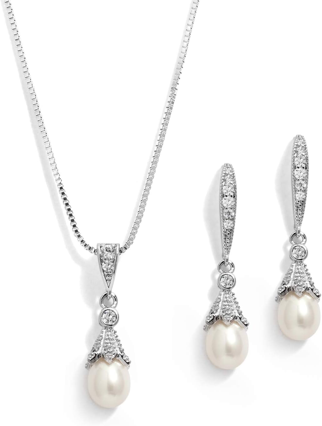 Mariell Wedding Necklace & Earrings CZ Jewelry Set with Dainty Freshwater Pearl for Bridesmaids & Brides