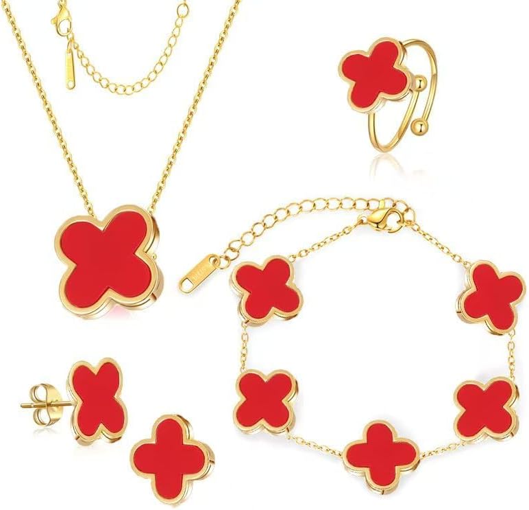 LUCKY CLOVER 18K Gold Plated Jewelry Set for Women With Gift Packaging Box, Gift for Women for Birthday, Vlentine's Day, Chiristmas, New Year, Anniversary (Red)