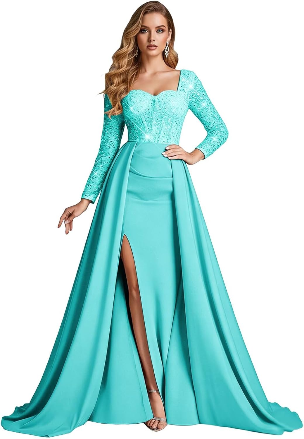 Long Sleeve Prom Dress 2026 Satin Square Neck Formal Gown with Slit Prom Wedding Party