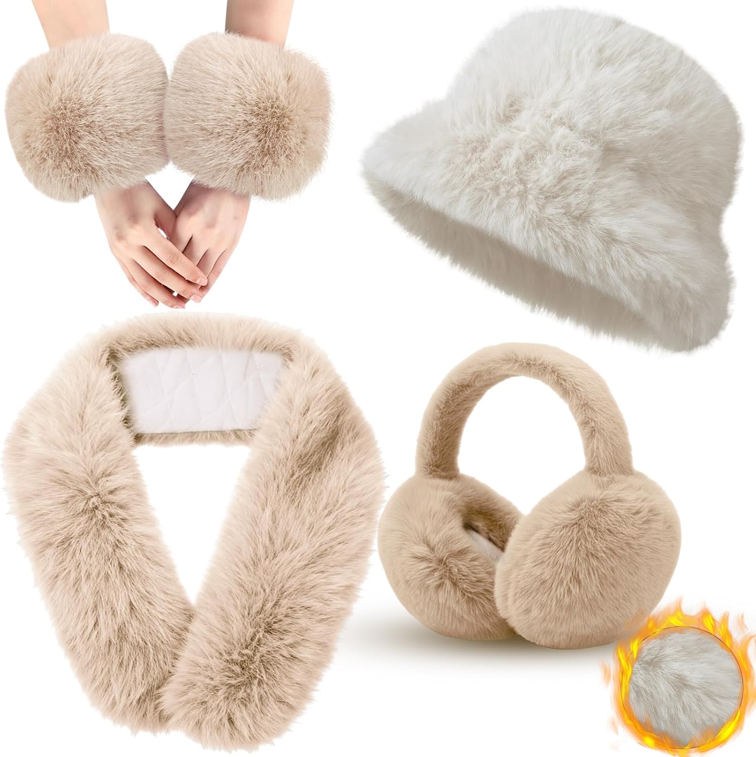 4 Pcs Winter Faux Fur Set for Women Fur Collar Scarf Wrap Winter Fuzzy Bucket Hat Ear Muffs Foldable Wrist Cuffs Accessories