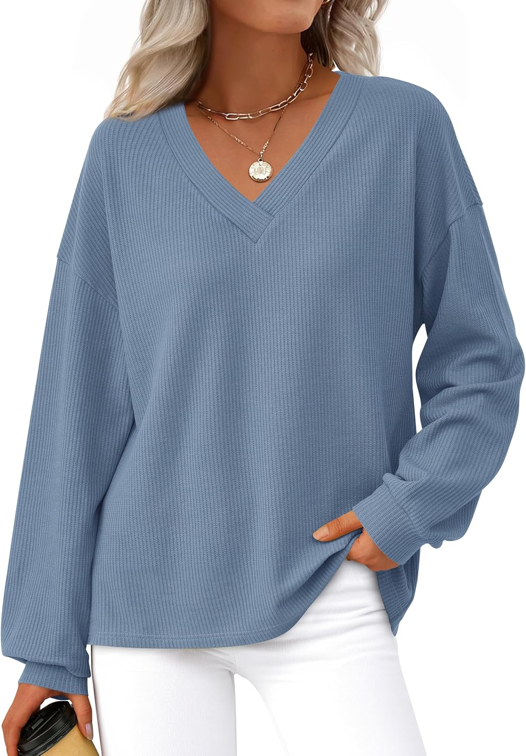 MASCOMODA Womens Tops Casual V Neck Waffle Knit Long Sleeve Shirts Trendy Loose Tunic Pullover Work Blouses Fall Outfits(Blue,XX-Large)