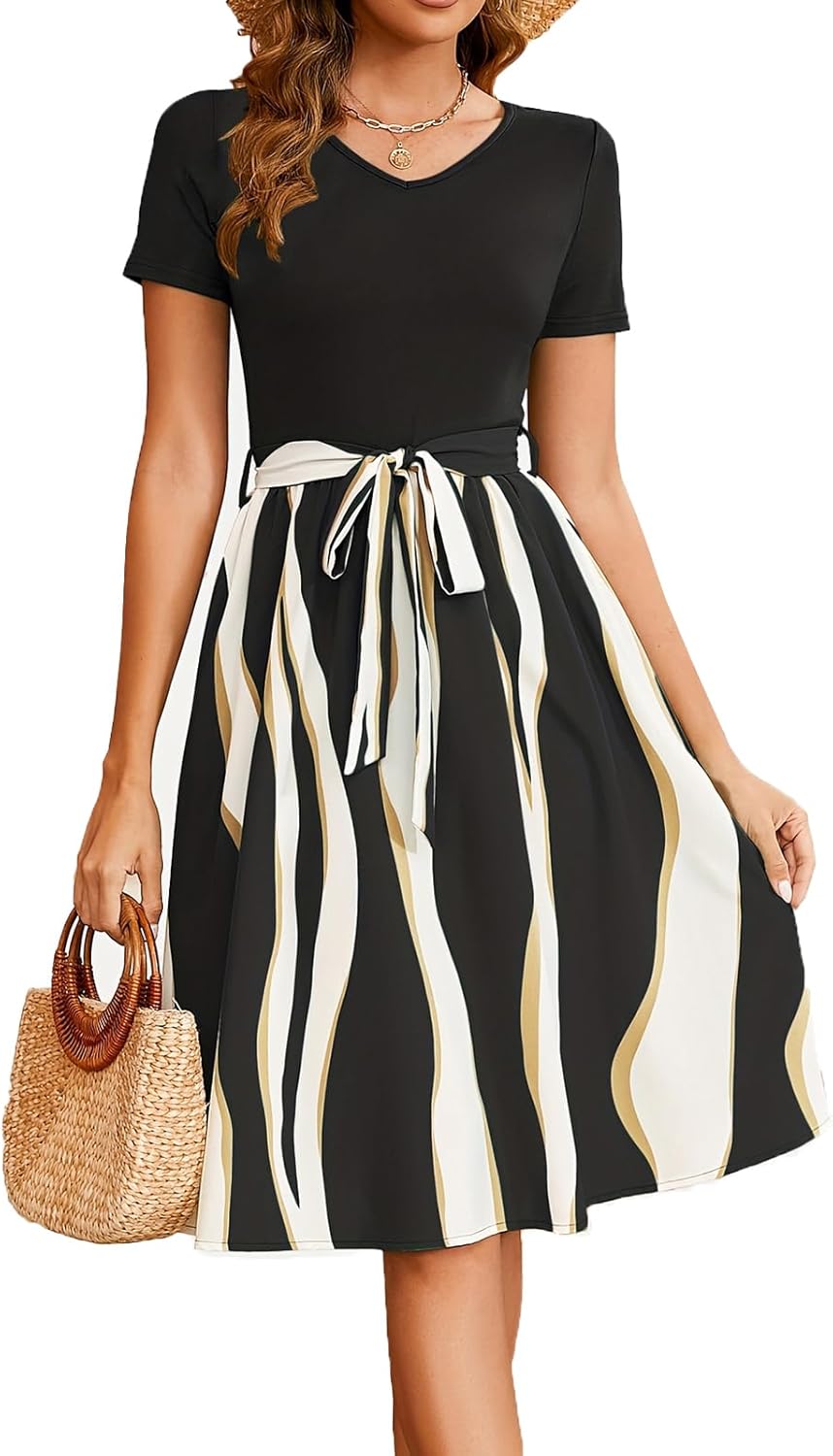 Women's Elegant Vintage V Neck Short Sleeve Summer Casual Work Party A-Line Dress with Belt 824