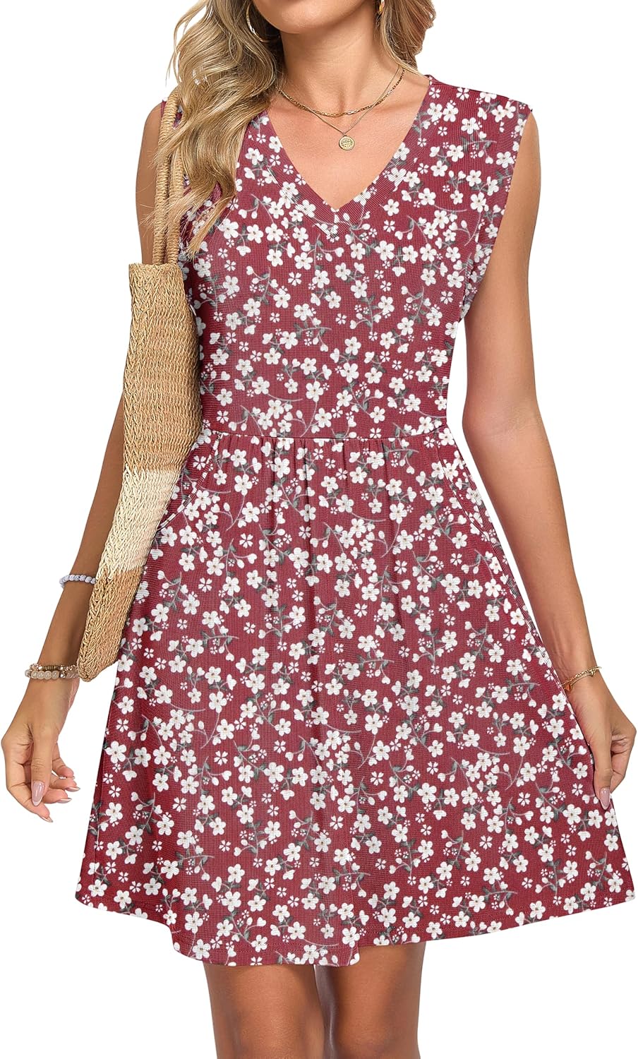 MISFAY Women's Summer Dress 2026 Waffle Cap Sleeves V Neck Sundresses A-Line Beach Flowy Vacation Mini Dress with Pockets