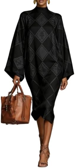 OSCORP Women’s Turtleneck Maxi Dresses with Paisley Abstract Ethnic Geometric Prints Bell Sleeve Loose Fit Elegant Style