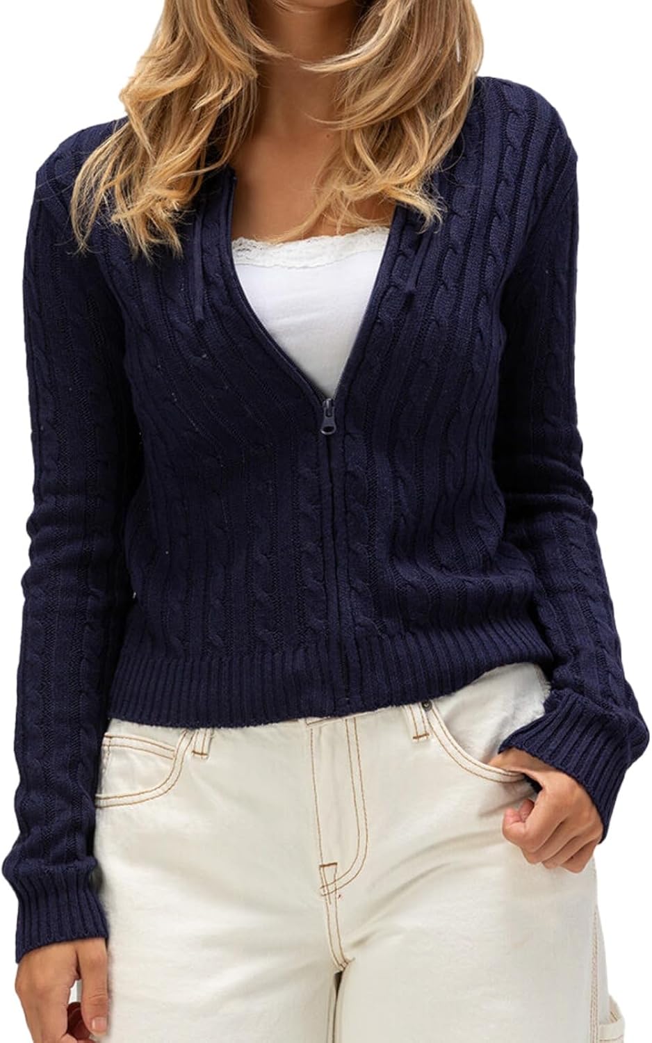 Women Zip Up Hoodie Y2k Vintage Long Sleeve Knitted Sweater 90s Knitwear Coat Jacket Streetwear
