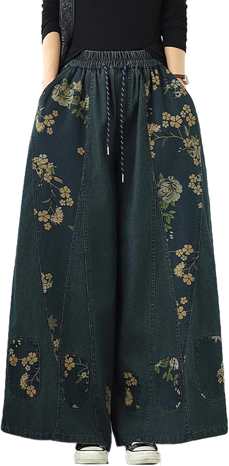 LAI MENG FIVE CATS Women's Casual Loose Denim Wide Leg Baggy Jeans Drawstring Elastic Waist Pants