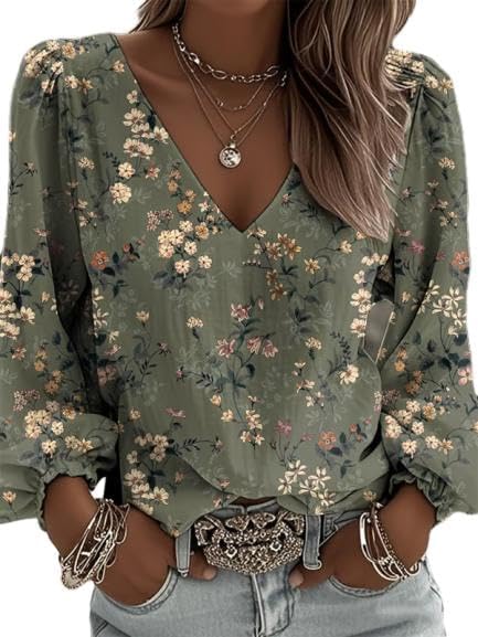 Women’s Boho V-Neck Long Sleeve Blouse Top – Olive Green Casual Vintage Floral Print Shirt