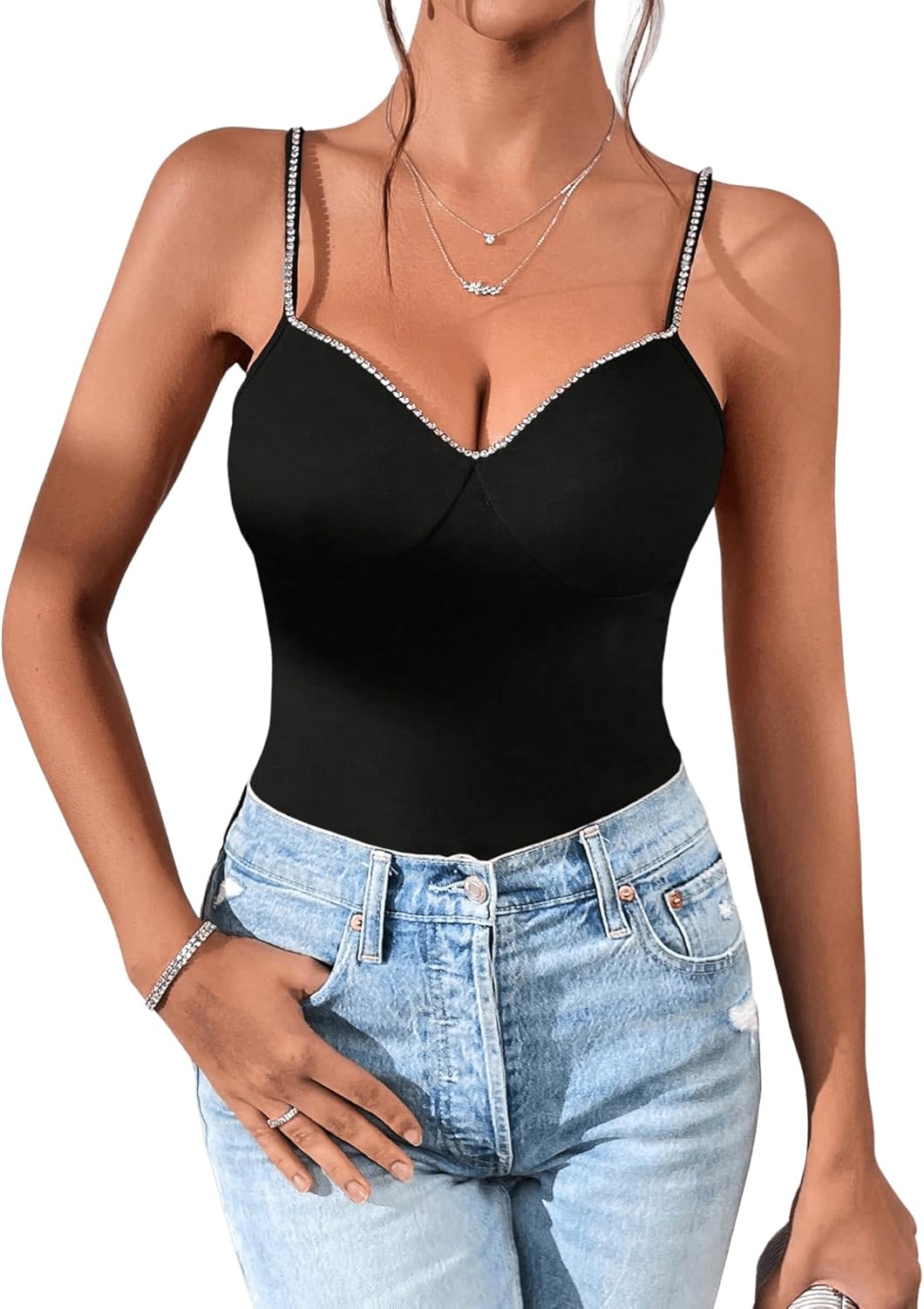 SOLY HUX Women's Rhinestone Cami Top V Neck Spaghetti Strap Slim Fit Camisole Summer Tops