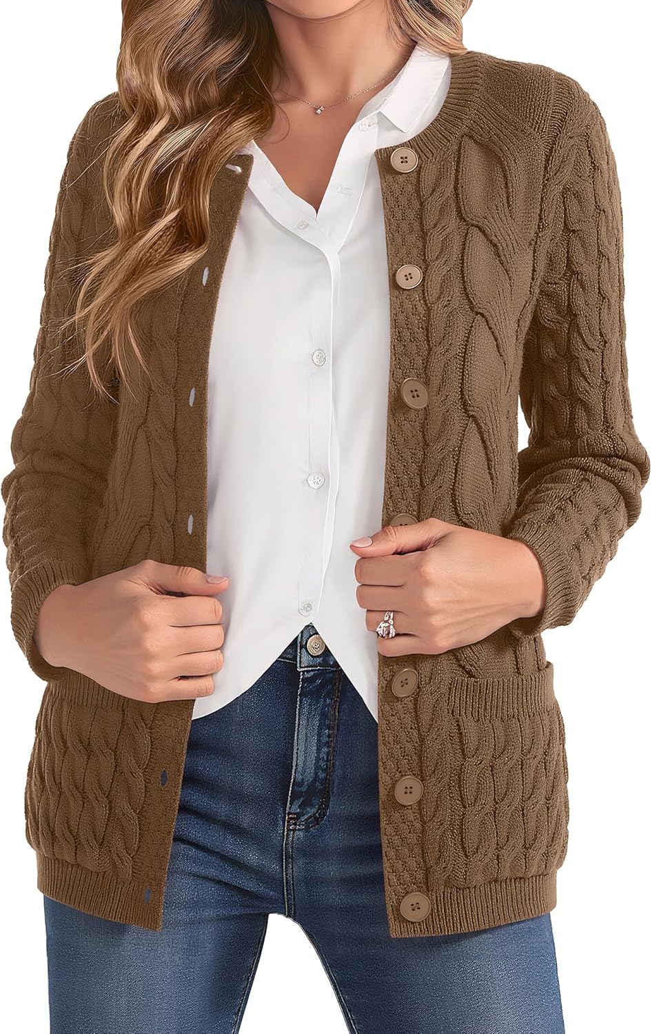 VIISHOW Women Cable Knit Cardigan Sweater Crew Neck Button up Cardigan with Pocket Sweater Coat for Fall and Winter