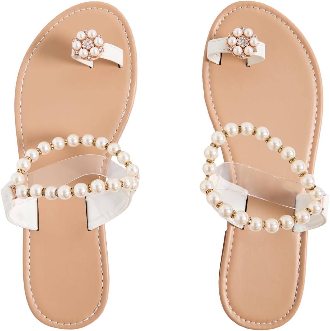 GORGLITTER Women's Clear Pearl Sandals Dressy Toe Ring Rhinestone Slide Wedding Vacation Bridal Flats Sandal 2025