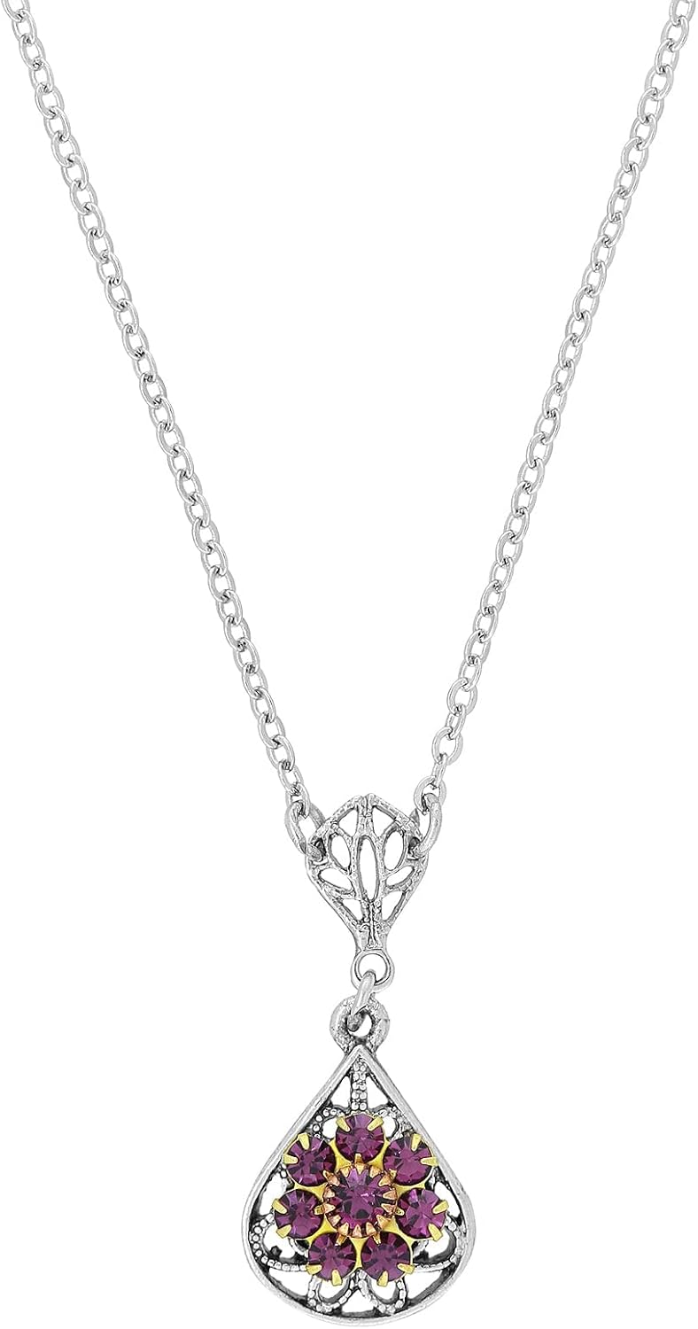 1928 Jewelry Flower Crystal Cluster Teardrop Filigree Pendant Necklace For Women 16" + 3" Extender