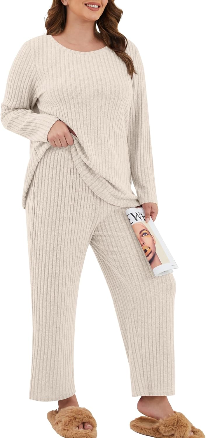 Womens Plus Size Lounge Pajamas 2 Piece Pj Sets Soft Long Sleeve Ribbed Tops Wide Leg Pants with Pockets