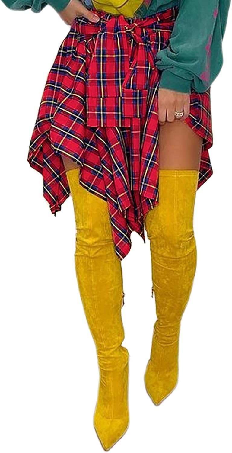 Women's Plaid Skirts High Waisted Knot Front Asymmetrical Hem Mini Skater Skirt