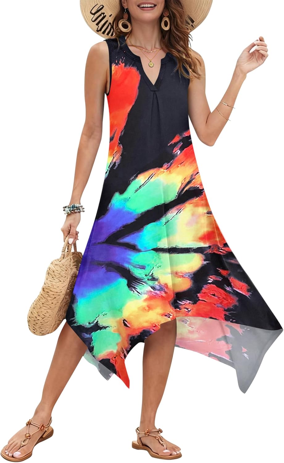 AUSELILY Summer Dresses for Women 2026 Casual Sleeveless Sundress Asymmetrical Hem Tank Midi Dress with Pockets