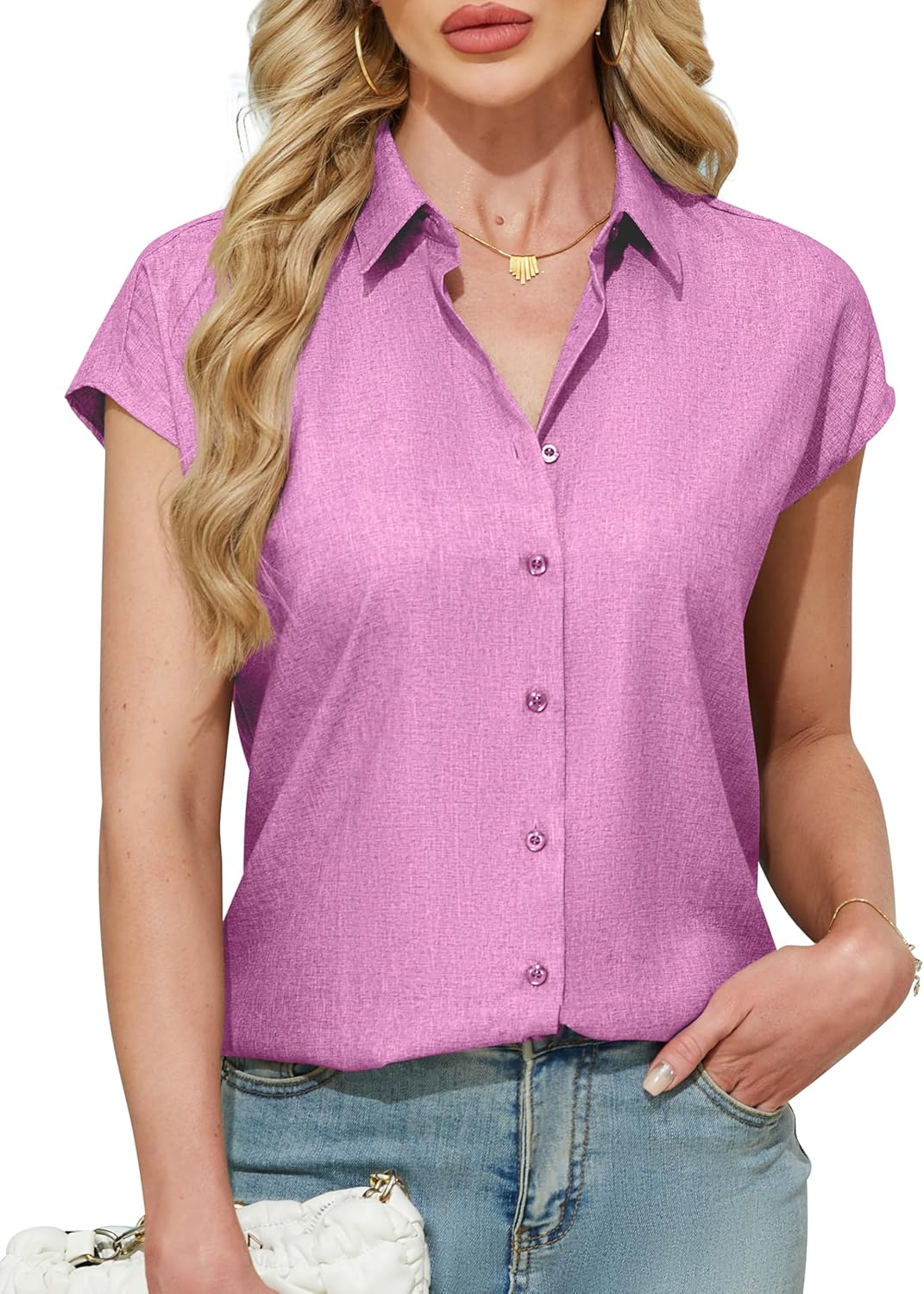 Ruisin Womens Linen-Look Cap Short Sleeve Button Down Shirts for Women Blouses Collared Shirt Summer Tops Wrinkle Resistant