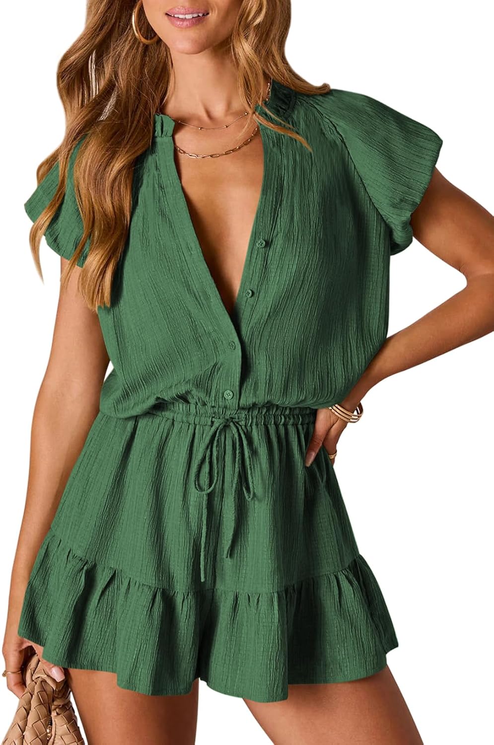 Fixmatti Summer Rompers for Women 2026 V Neck Short Sleeve Button Up Ruffle Jumpsuit Outfit with Pockets