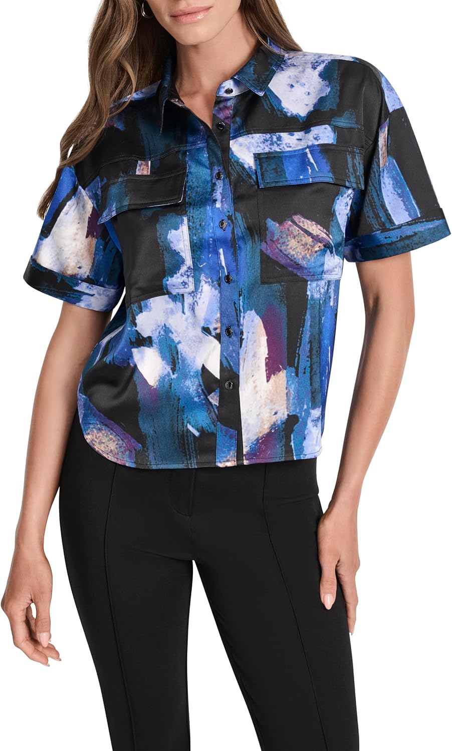 DKNY Womens Short Sleeve Collared Blouse