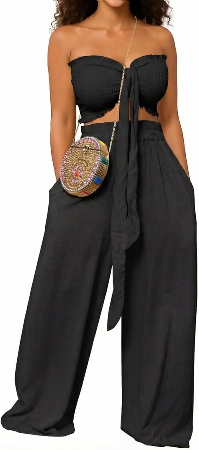 Ophestin Women Two Piece Outfits Knot Front Ruffle Trim Smocked Crop Top Wide Leg Pant Sets Vacation Outfit with Pockets