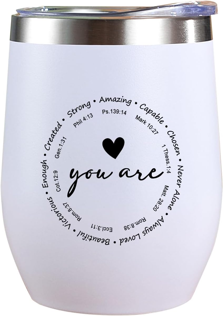 - Multi Purpose Gifts: Printed with classic and encouraging bible quote, the 12oz stainless steel wine tumblers are great christmas gifts, birthday gifts, best friend gifts, wife gifts, sister gifts, self care gifts, get well soon gifts, employee appreciation gifts, coworker gifts, retirement gifts, Valentines gifts, inspirational gifts, religious gifts for women/men. Ideal for thanksgiving, Easter, baptism, prayer, bible study group, and other religious events, reminding them of God's promises for life.