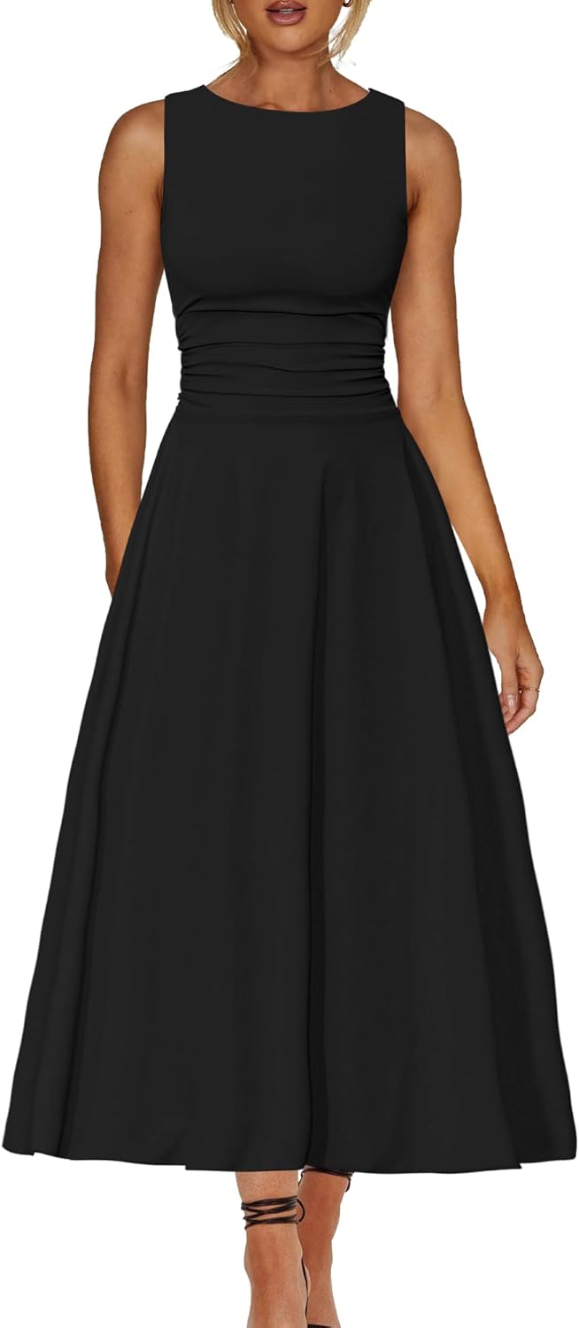 Kaximil Women's Boat Neck Sleeveless A Line Maxi Dress Ruffle Flowy Casual Long Dresses