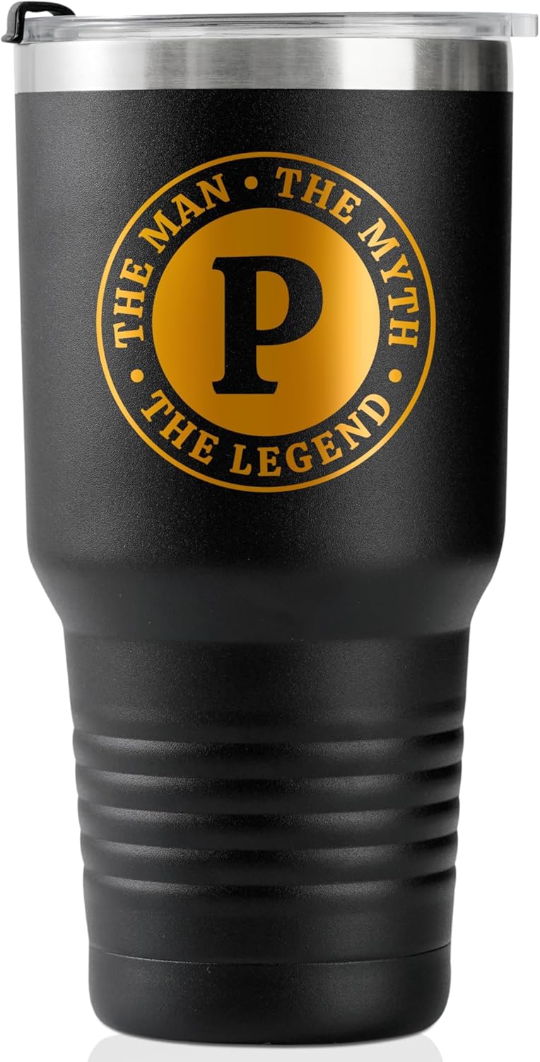 the Man the Myth the Legend Mug with Initials, Monogrammed Stainless Steel Travel Tumbler for Men, Funny Personalized Coffee Cup, Custom Beer Glass, Unique Birthday Christmas Gifts for Him, 30 oz, P