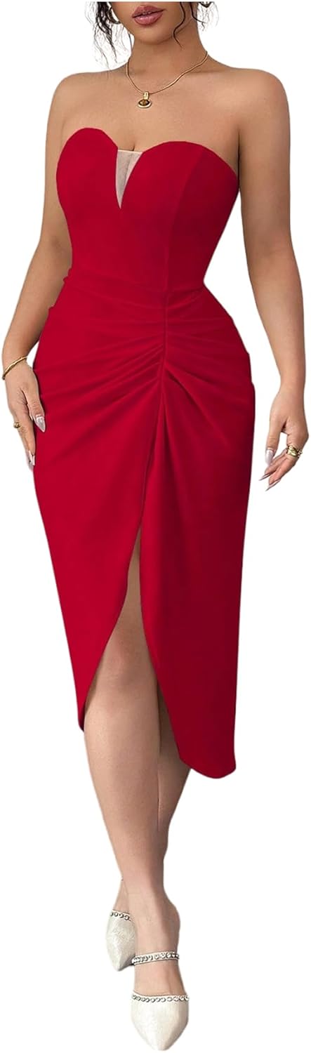 OYOANGLE Women's High Slit Ruched Bodycon Midi Dress Strapless Asymmetrical Cocktail Party Dresses