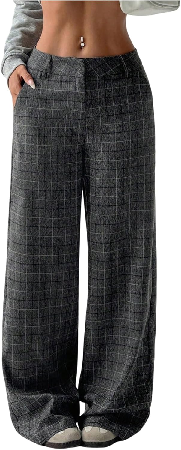 MakeMeChic Women's Plaid Wide Leg Pants Low Waist Business Trousers with Pockets