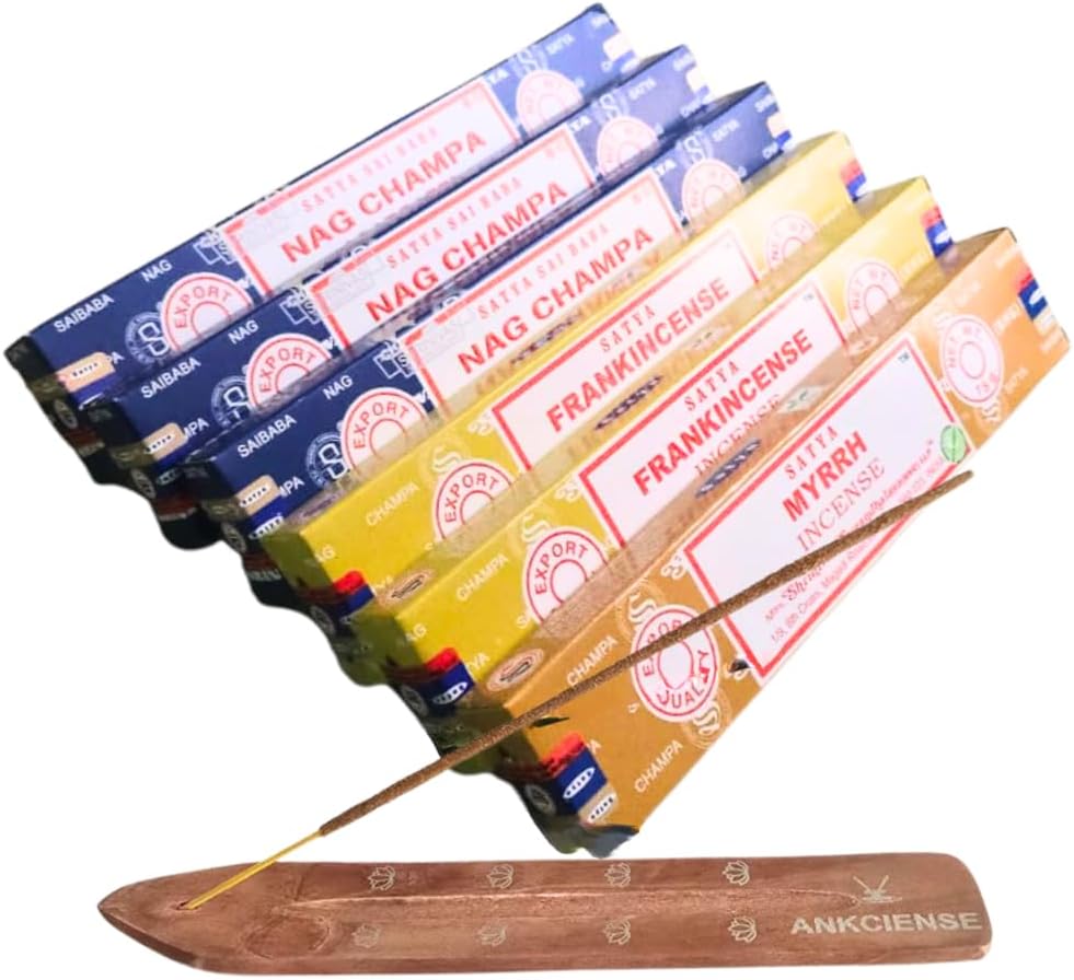 Satya Nag Champa, Frankincense & Myrhh with ANKCIENSE incense holder pack of 3 fragrances variety pack of 90 sticks Insense Insence