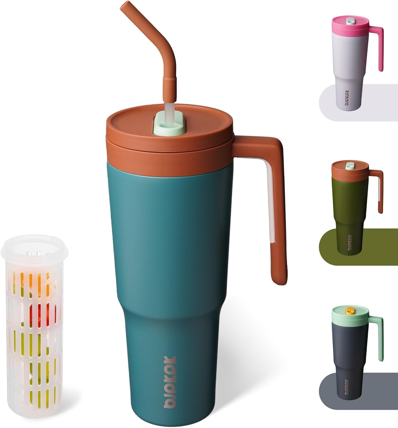 - BJPKPK Reusable Travel Thermal Cup Is Designed For Everyday Use, Travel, Work, Sports, Swimming, Camping, Parties Etc; These Tumblers Cups Are Also Wonderful Gifts Options For nniversaries, Christmas, Thanksgiving, Mother's Day, and Father's Day, Package include: 1 x Tumbler with Handle, 1 x Removable Fruit Infuser, 1 x Screw Lid, 1 x Silicone Plugs, 1 x Silicone Straws, 1 x Silicone Tip