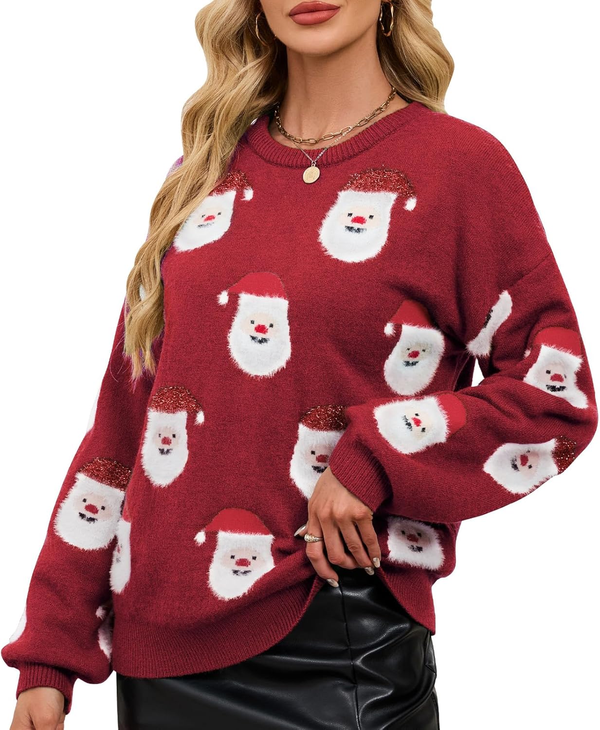 Ugly Christmas Sweater for Women Funny Santa Long Sleeve Knitted Xmas Pullover Cute Wintertime Holiday Parties Tops