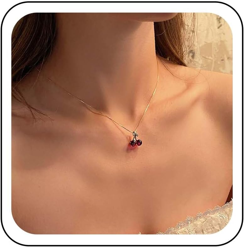 Red Crystal Cherry Pendant Necklace - Gold Leaf Choker with Vintage Box Link Chain - Cherry Red Agate Statement Jewelry for Women