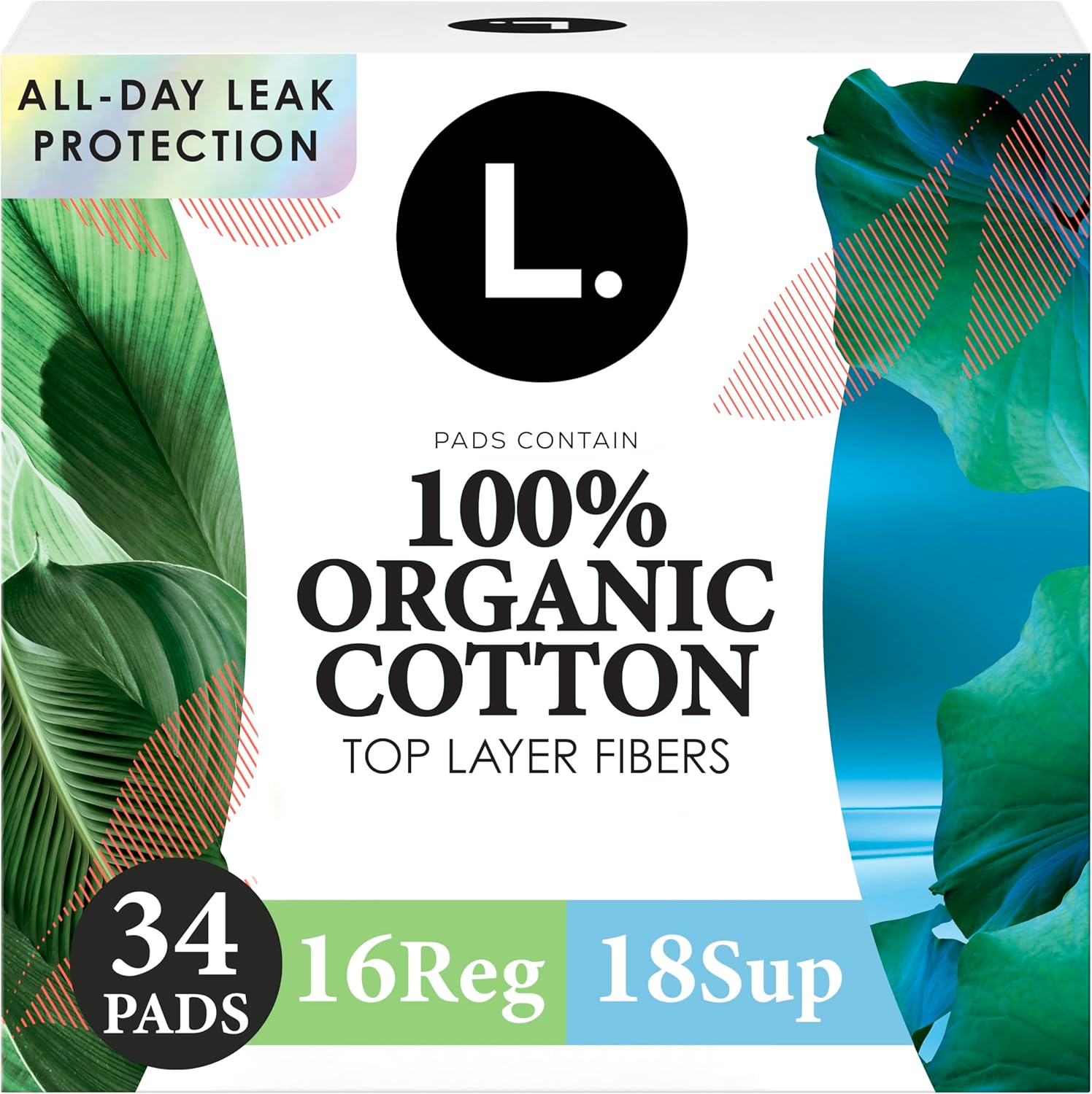 L. Ultra Thin Pads for Women, Organic Cotton Top Layer, Regular + Super Duo Pack Absorbency, Menstrual Pads with Wings, Made Without Synthetic Pesticides and Fragrances, 34 Count