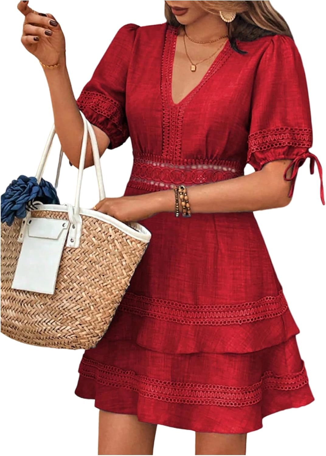 SOLY HUX Women's Summer Dress Hollow Out Lace V Neck Puff Short Sleeve A Line Layered Short Dresses