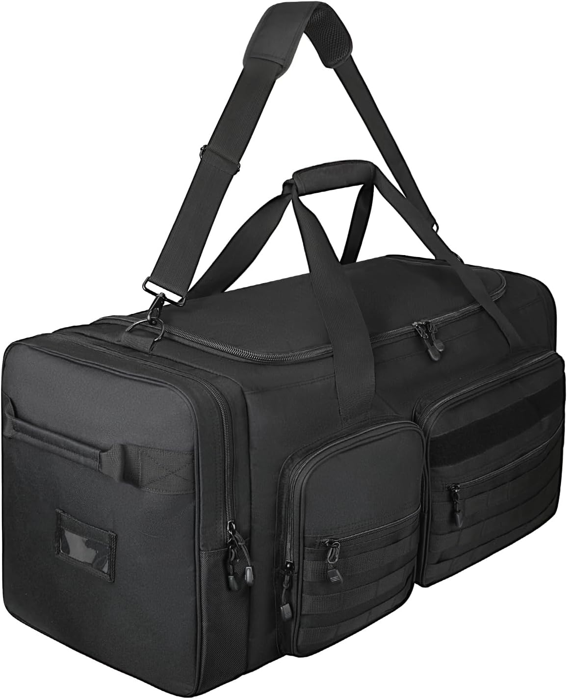 - 7 Compartments: Equipped with 7 compartments, this tactical duffle bag ensures everything has its place.The main compartment can accommodate your clothes, helmets, catchers, gloves, protective gear, and other sports equipment. The first four pockets can store mobile phones and other personal items. The independent pockets on both sides can store items such as water bottles, umbrellas, shoes, etc
