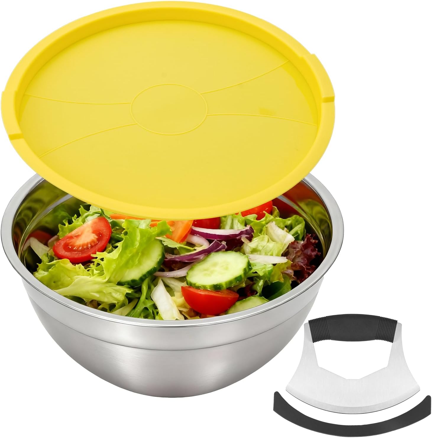 Salad Chopper Bowl and Cutter with Lid, Stainless Steel Chopping Bowl, Mezzaluna Mincing Knife with Protective Cover, Snap-Tight Storage Lid, for Super-Fast Salad Prep