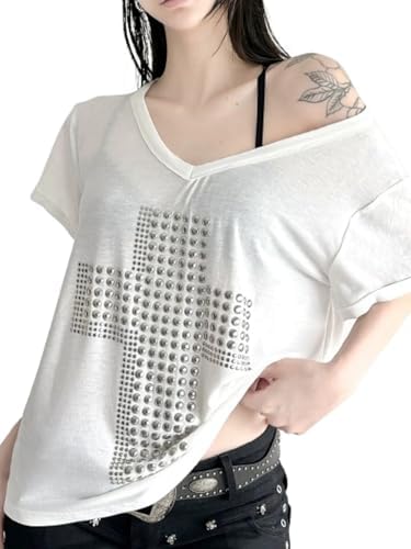 Oversized Metal Sequins Cross Graphic Tee Goth Off The Shoulder Tops V Neck Tshirts Grunge Emo Clothes Punk Tees Y2K